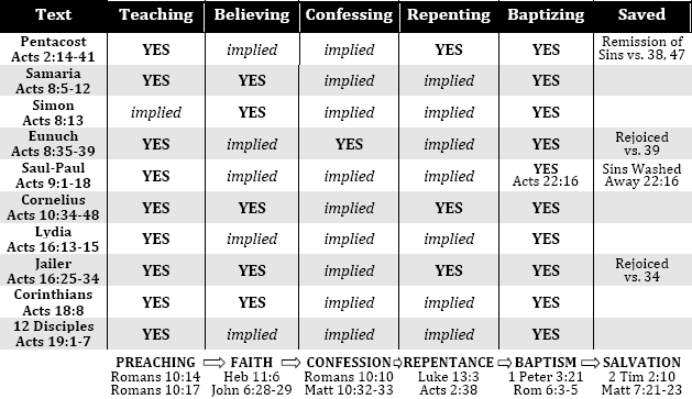 Every New Testament conversion in the book of Acts demonstrates that baptism is involved in God's process of saving man. Take a look at the following chart: